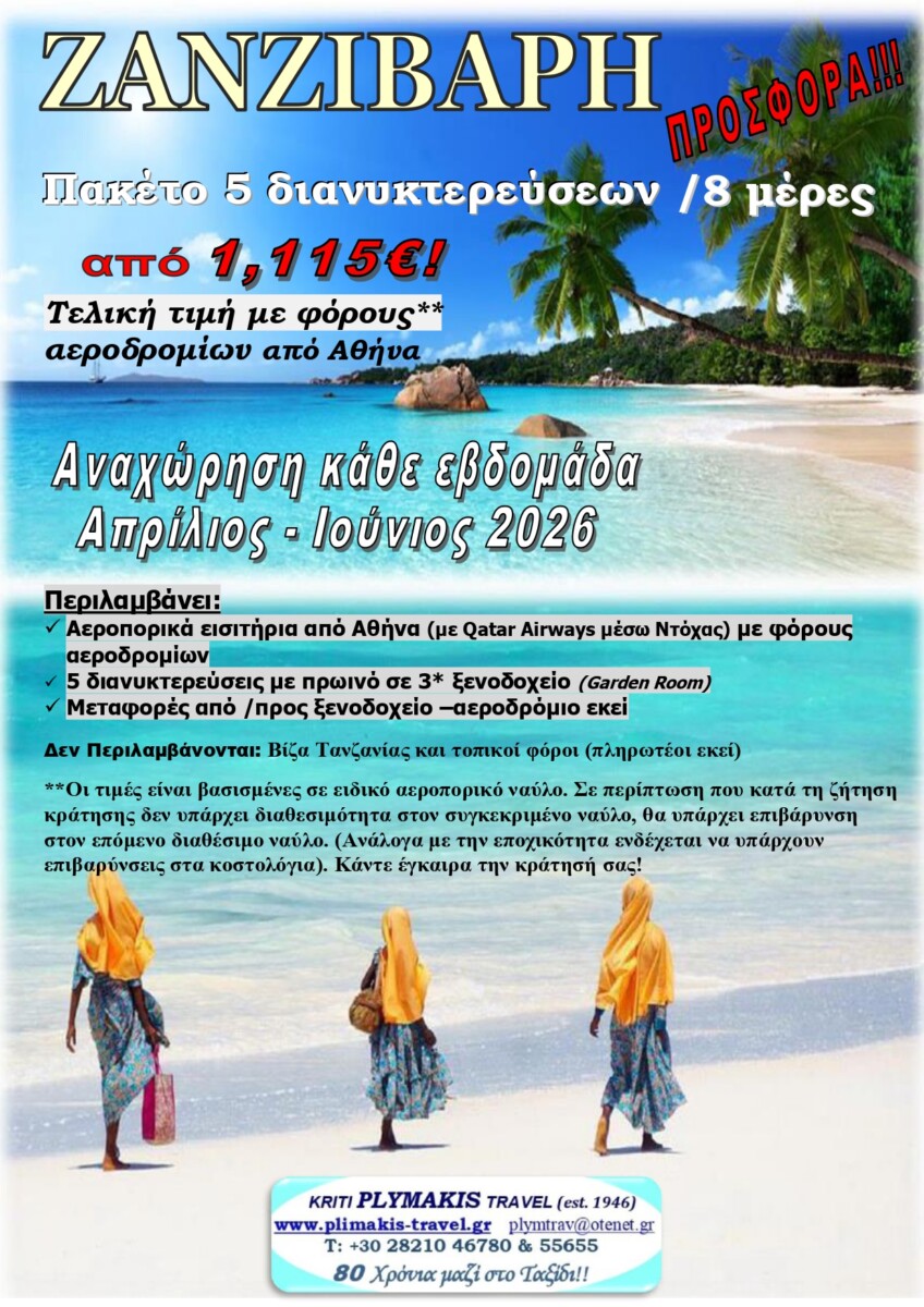 ΖΑΝΖΙΒΑΡΗ Απρίλιος -Ιούνιος 2026 ΠΡΟΣΦΟΡΑ! 8μέρες /5 διανυκτερεύσεις από Αθήνα. Τελική τιμή (με φόρους): από 1,115€